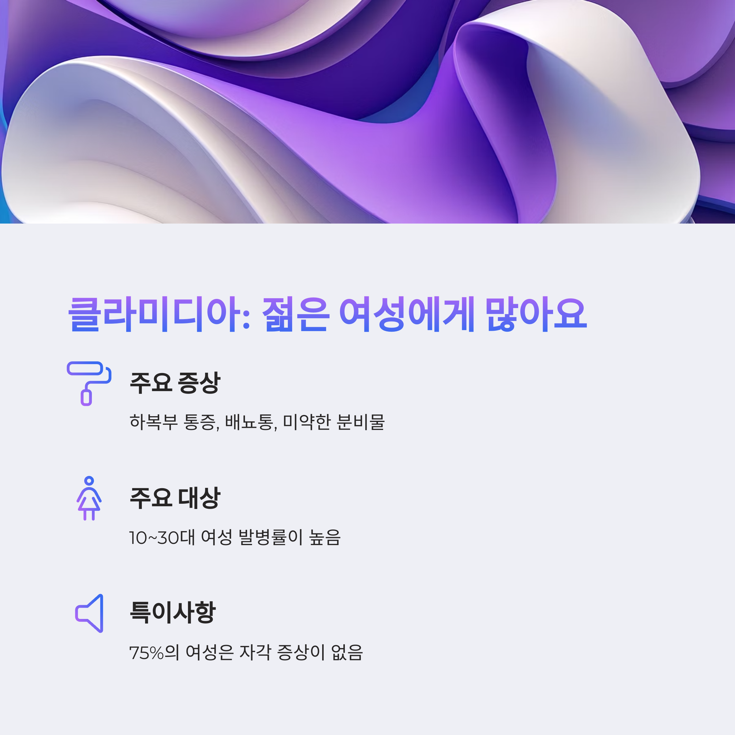 주요 증상: 배뇨통, 하복부 통증, 일반적으로 증상이 없음.